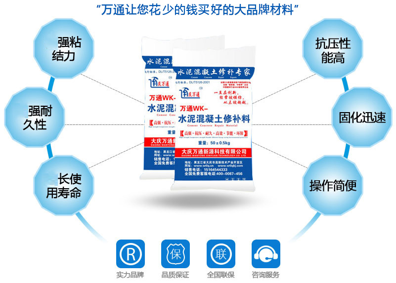 大慶萬通新源科技有限公司獨有的混凝土路面高強速補料,是水泥混凝土路面病害修復的好材料。疲勞、凍融循環(huán)、彎曲壓力、滲水和基層破壞等原因都會引起水泥路面的破損,從而帶來高昂的維護費用。與以往的剛性修補方法不同,混凝土水泥路面維修速補膠提供了一種獨特的柔性修補產品和技術,高柔性、高抗拉性,可跨伸縮縫施工和高抗壓性使得混凝土快補產品為水泥混凝土路面提供了******性的修補。傳統的剛性修補方案,如環(huán)氧砂漿和快干水泥產品,由于其自身的粘結失效,抗疲勞性低以及與原路面不同的伸縮系數,修補面會在短時間內失效或產生新的裂縫,需要反復修補,有效期短且費用高昂。大慶萬通新源科技有限公司的混凝土水泥路面維修速補膠可以隨原路面一起伸縮,移動,從而避免了粘結失效和產生新裂縫。萬通快補產品優(yōu)異的粘結性、柔韌性和高防滑性,特別適用于水泥路面的淺層粘合修補,多邊角混凝土板層修補,跨伸縮縫修補以及路面沉陷修補。萬通混凝土病害修補料針對混凝土起皮起沙、斷板裂縫、蜂窩麻面、坑槽露石子、漏筋掉皮、橋梁的掉皮漏筋快速通車使用時間長。應用萬通快補產品,施工后一天就可以恢復交通。大慶萬通新源科技有限公司的萬通水泥路面維修速補膠適用于高速公路、機場路面、農村村村通路面、廠坪、學校操場、市區(qū)公路、小區(qū)路面、橋梁、水泥路面的修補。使用萬通特快補材料修補路面可以一勞永逸! 水泥地面起砂怎么辦,混凝土修補劑混凝土地面起砂,混凝土地面修補,地面起砂怎么辦,